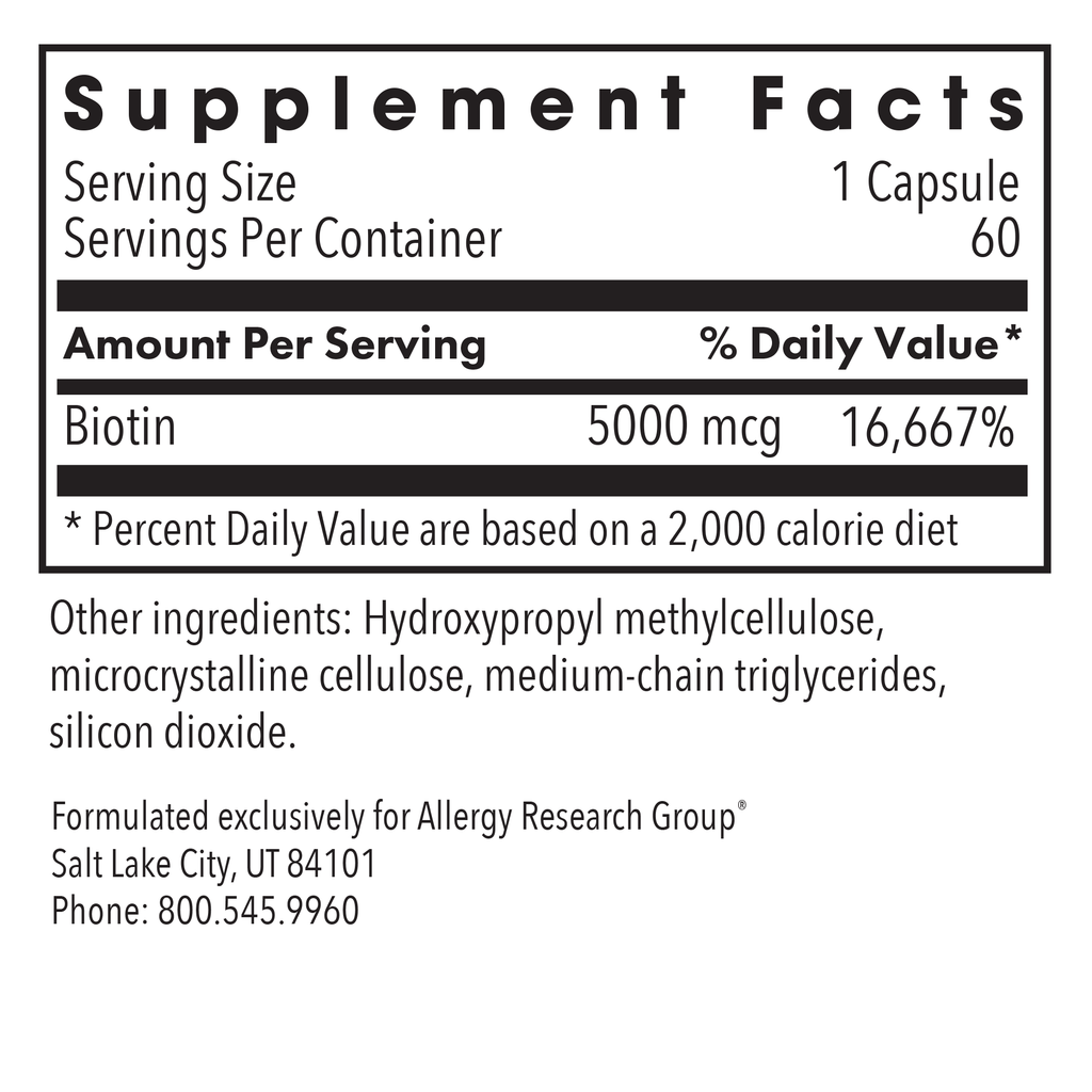 Biotin 5000 delivers 5000 mcg of biotin to support cellular energy production, fat and glucose metabolism, and the structural health of skin, hair, and nails.* This essential B vitamin plays a key role in converting food into energy and supporting keratin synthesis, ideal for individuals seeking metabolic support or enhanced aesthetic health.*