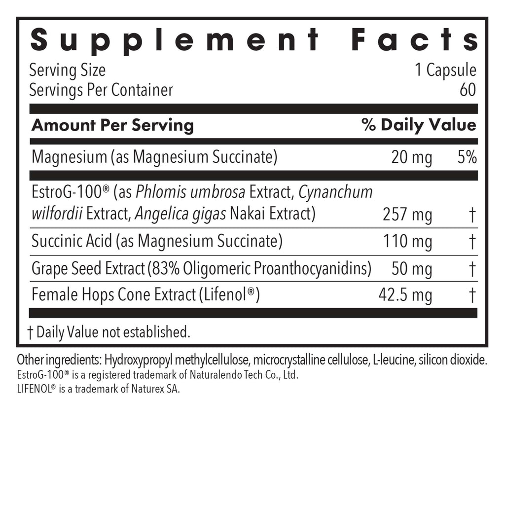 Flashes No More combines clinically-studied EstroG-100® and Lifenol® hops extract as well as grape seed extract, and magnesium succinate to support relief from hot flashes, night sweats, mood changes, and other menopausal symptoms.* Designed for comprehensive menopause support, Flashes No More delivers clinically relevant doses shown to support somatic, emotional, and bone health while enhancing overall quality of life.*