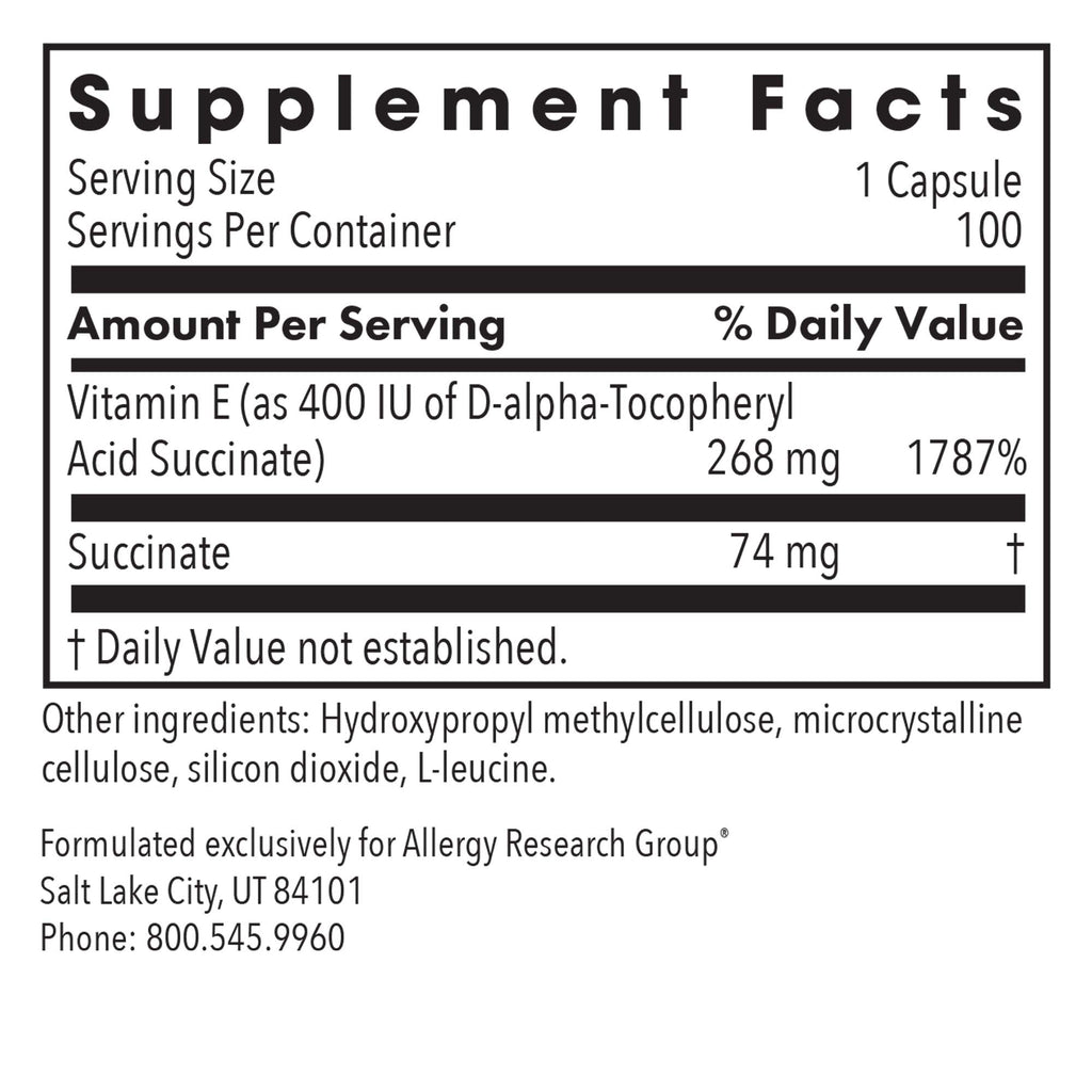 Vitamin E as d-alpha-tocopheryl acid succinate, as a dry powder in a hard-shell vegetarian capsule. Provides vitamin E, and succinate, which plays a role in the Krebs cycle, our major metabolic pathway for generating energy.* Each capsule contains 400 IU of vitamin E.