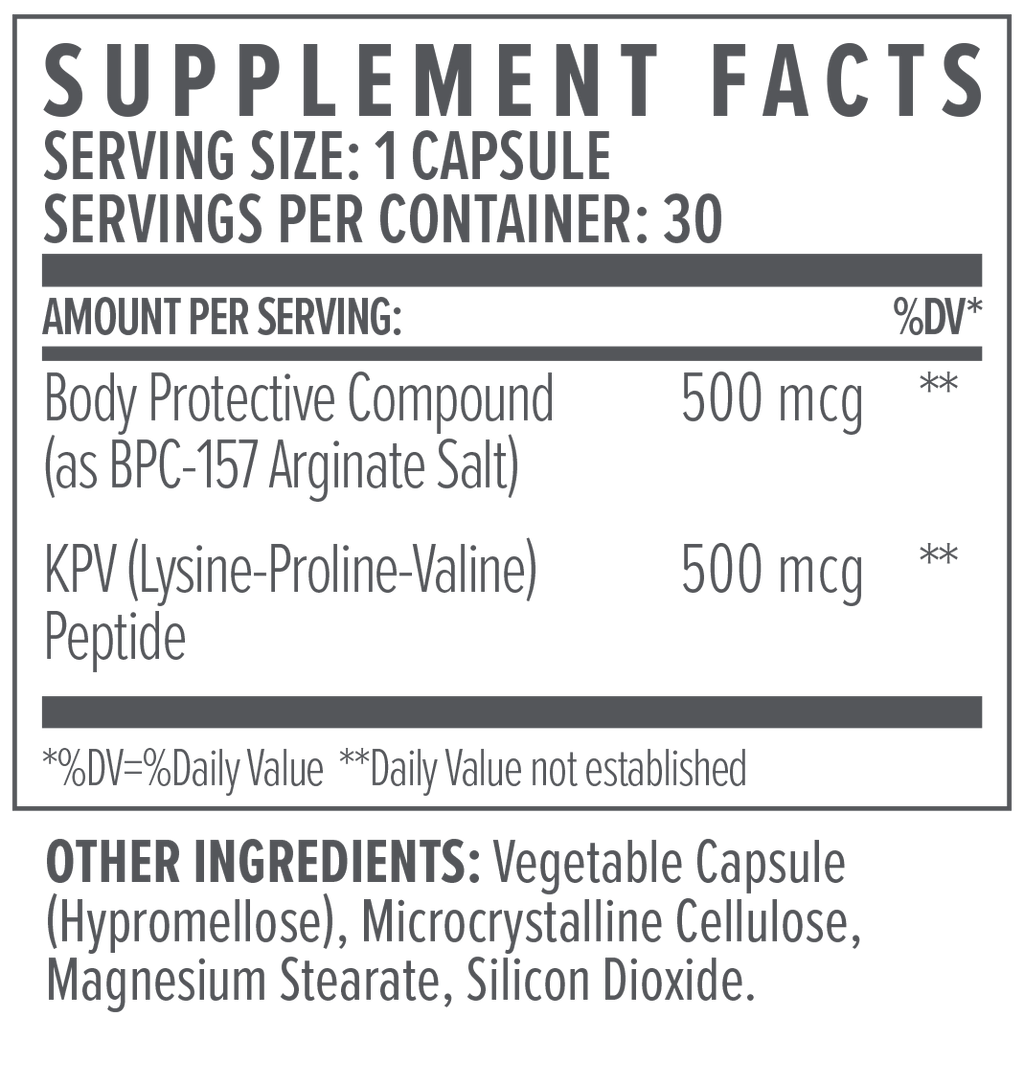 BPC-157 is an endogenous peptide. Non-human studies have suggested that BPC-157 supports a healthy gut; healthy immune modulation; and healthy muscle, tendon, ligament, and wound healing. KPV has also been shown in non-human studies to support healthy immune modulation; a healthy gut; and healthy muscle, tendon, ligament, and wound healing.*