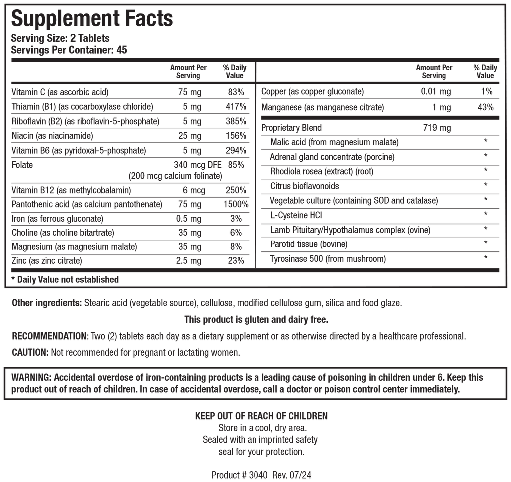 ADB5-Plus™ is a specific blend of vitamins, minerals, amino acids and other important nutritional synergists to support healthy adrenal function. This product includes glandulars in the form of adrenal gland concentrate (porcine), lamb pituitary/hypothalamus complex (ovine), parotid tissue (bovine). These glandular components serve to provide raw materials and vital chemical messengers which aide in the functional support of the adrenals.