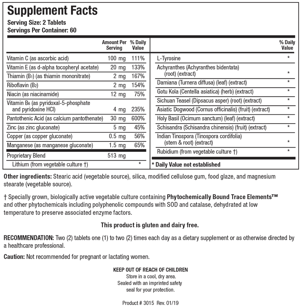 Two (2) tablets one (1) to two (2) times each day as a dietary supplement or as otherwise directed by a healthcare professional.Not recommended for pregnant or lactating women. KEEP OUT OF REACH OF CHILDREN.