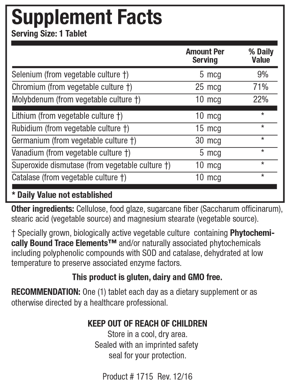Basic Nine™ is a blend of trace minerals needed in small quantities for optimal human health. Typically left out of the conversation, these minerals, like those more commonly focused on, are lacking in the average diet. Basic Nine™ provides each of these minerals in a phytochemically-bound form. Additionally, it includes the antioxidant enzymes SOD and catalase. For those looking to optimize their nutritional support to the minute level, this group of minerals is an ideal choice.