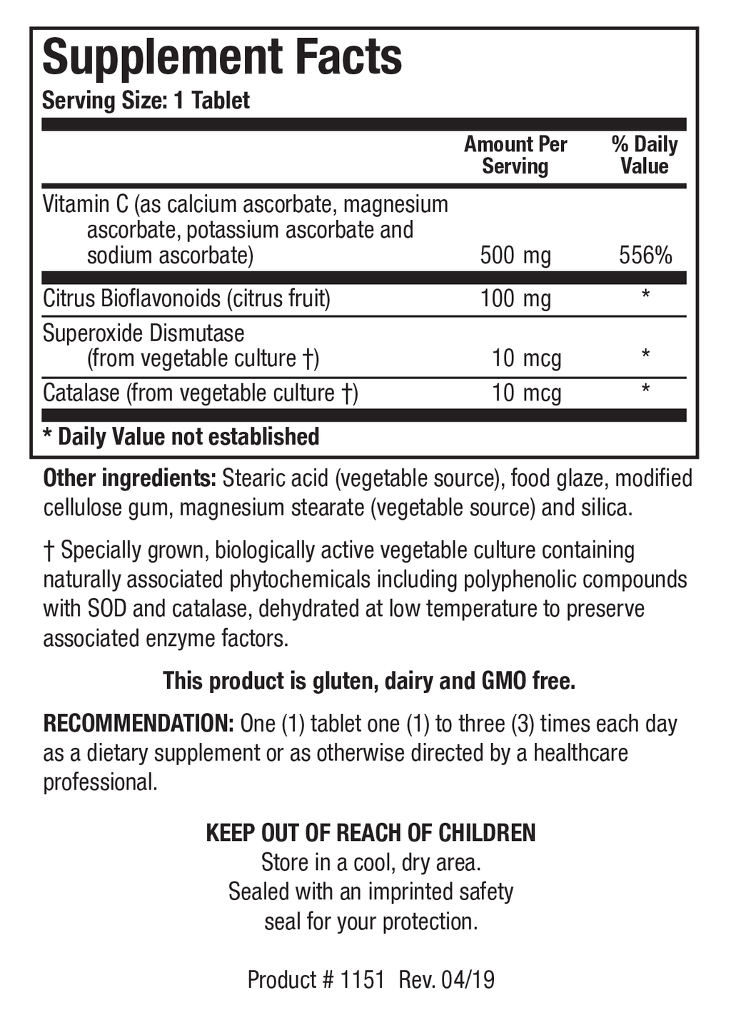 Bio-C Plus™ provides 500 mg vitamin C as mixed mineral ascorbates, combined with citrus bioflavonoids, SOD and catalase. Vitamin C is best known for its role as an excellent antioxidant. Bio C Plus™ may be beneficial whenever supplemental vitamin C is recommended.