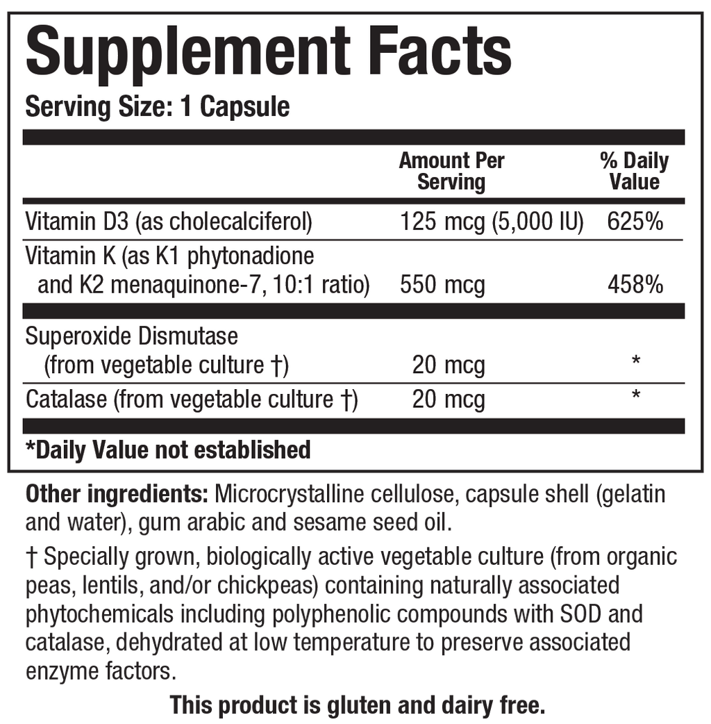 Bio-DK Caps™ supplies 125 mcg (5,000 IU) of vitamin D3, 550 mcg of vitamin K (as K1 phytonadione and K2 menaquinone-7) as a micro-emulsion for enhanced absorption and utilization. In addition to emulsified forms of vitamins D and K, Bio-DK Caps™ contains the enzymes superoxide dismutase (SOD) and catalase. SOD aids in cell repair and provides antioxidant protection against cellular damage from free radicals and environmental toxins. Catalase converts hydrogen peroxide into oxygen and water, also showing strong antioxidant properties.