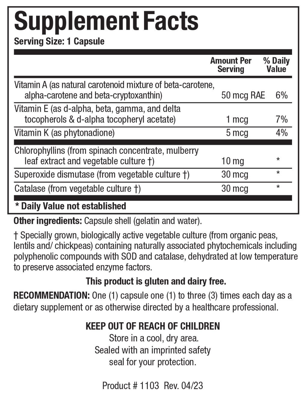 Chlorocaps™ supplies both water and lipid-soluble chlorophyllins, along with lipid soluble vitamins, and SOD and catalase, which function as important antioxidant enzymes. Chlorophyll has been called the "blood" of the plant world, and has the same structure as the heme of blood (except that where the heme carries an iron mineral in the center, the chlorophyll carries magnesium). Thus it may be beneficial in supporting blood quality, and it is a good source of magnesium.*