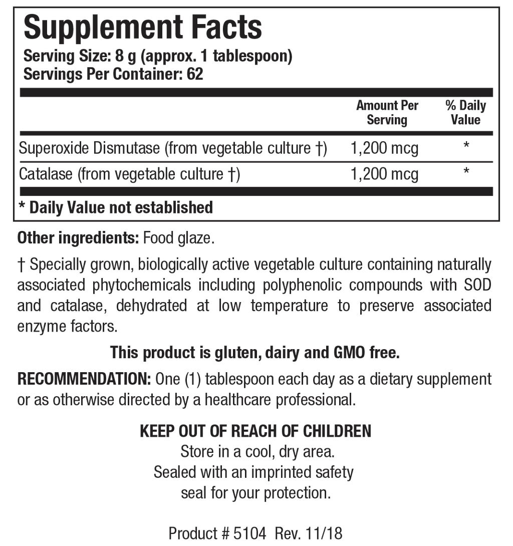 Dismuzyme Plus Granules™ supplies superoxide dismutase (SOD) and catalase from a proprietary vegetable culture. SOD is the primary enzymatic free radical scavenger in humans. It functions to convert superoxide radicals to hydrogen peroxide and oxygen. Likewise, catalase converts hydrogen peroxide to oxygen and water, and therefore complements the activity of SOD. These activities are a crucial part of the cellular antioxidant defense mechanism, and by virtue of this function, these compounds play a role in moderating the natural aging process.* This product is offered in granulated form.