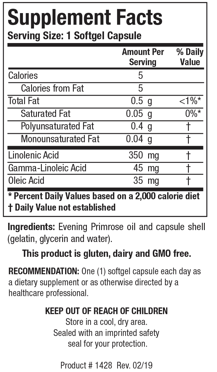Evening Primrose Oil is a supplemental source of all natural gamma-linolenic acid (GLA), the most health promoting omega-6 fatty acid. Together with the omega-3 fatty acids, omega-6 fatty acids are involved in a number of crucial roles in the body. GLA plays a key role in the regulation of the immune process as well as a natural inflammatory response.* It helps support the normal growth, development and function of the brain, and is beneficial for the stimulation of skin and hair growth, the maintenance of bone health, and the regulation of metabolism.* GLA also functions as an important component in the reproductive system.*