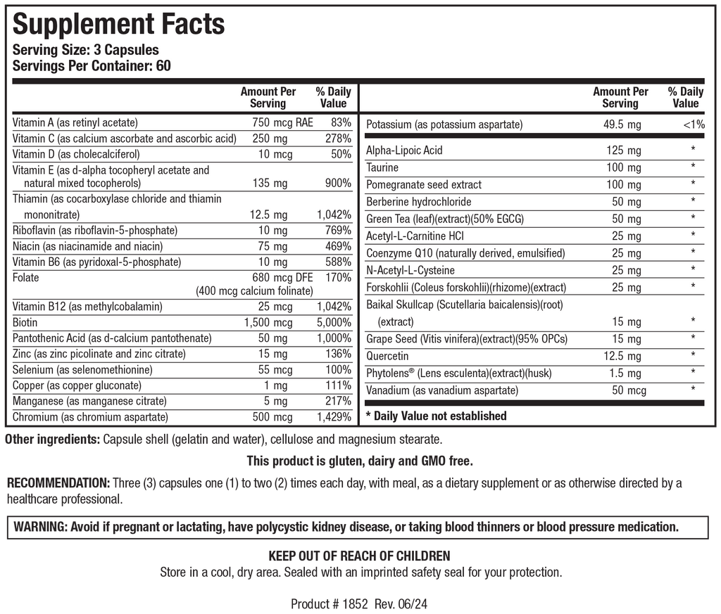 GlucoResolve® is a daily multivitamin specifically formulated to support healthy blood sugar levels. In addition to foundational vitamins and minerals, GlucoResolve® contains taurine, lipoic acid, pomegranate seed extract, EGCG, NAC, berberine, acetyl-l-carnitine, forskolin, grapeseed and quercetin that help foster healthy weight management, optimize metabolism, provide powerful antioxidants, and promote AMPK activity (which supports normal energy generating processes such as glucose uptake).