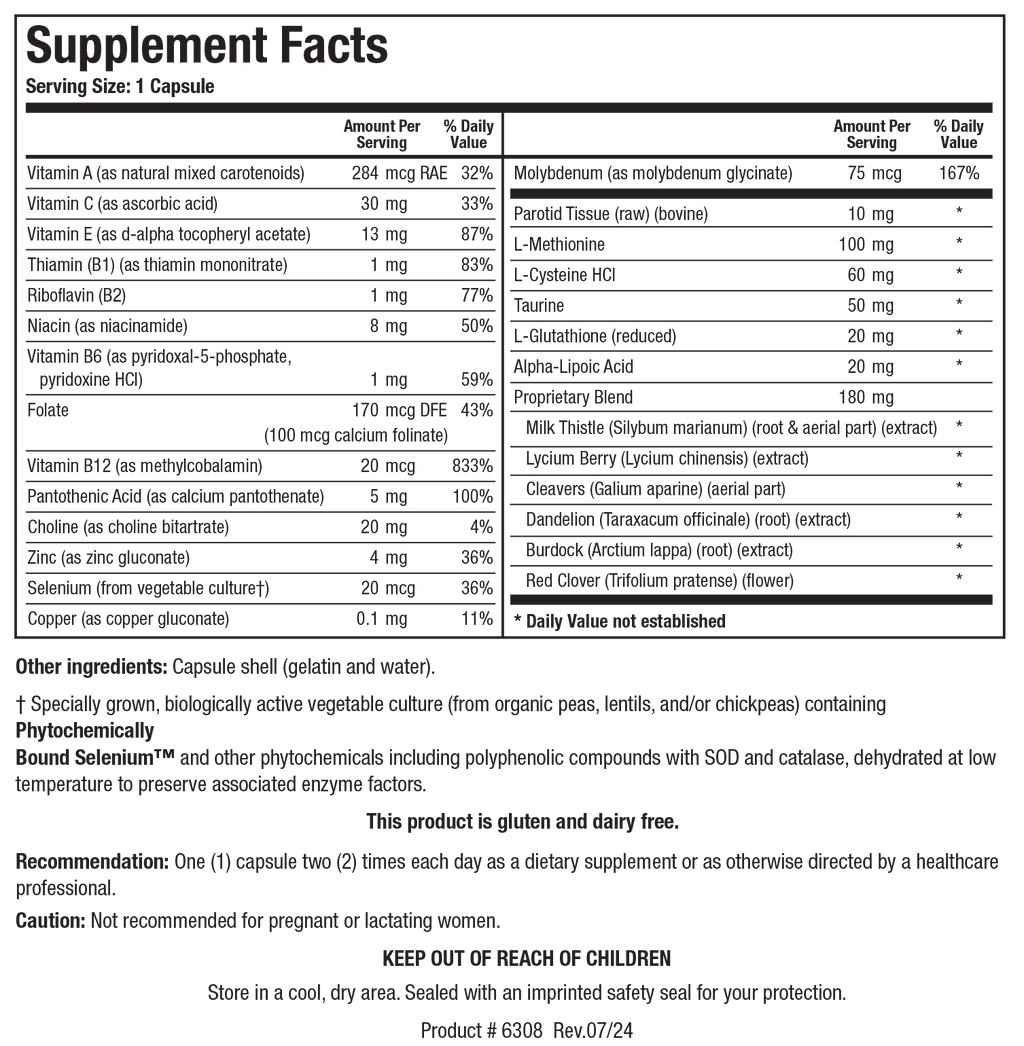 MCS®-2 (Metabolic Clearing Support) is a unique formulation combining vitamins, minerals, amino acids, botanical components, and other nutritive synergists to support healthy Phase I and Phase II liver detoxification pathways. Vitamin A, along with vitamins C and E, serve as cofactors for Phase II enzymes. Vitamin A is also essential for the normal functioning of the immune system, and acts as an important antioxidant, via its ability to scavenge reactive oxygen species. Carotenoids exhibit an extraordinary capacity to quench singlet oxygen molecules. Additionally, various trace minerals also play an important role in both detoxification and metabolic support. Herbal components are also known to possess hepatoprotective actions, and thus serve an important role in liver support during metabolic clearing and detoxification. MCS®-2 supplies a unique blend of herbs to support these processes, including milk thistle, lycium berries, cleavers, culvers, burdock, and red clover.