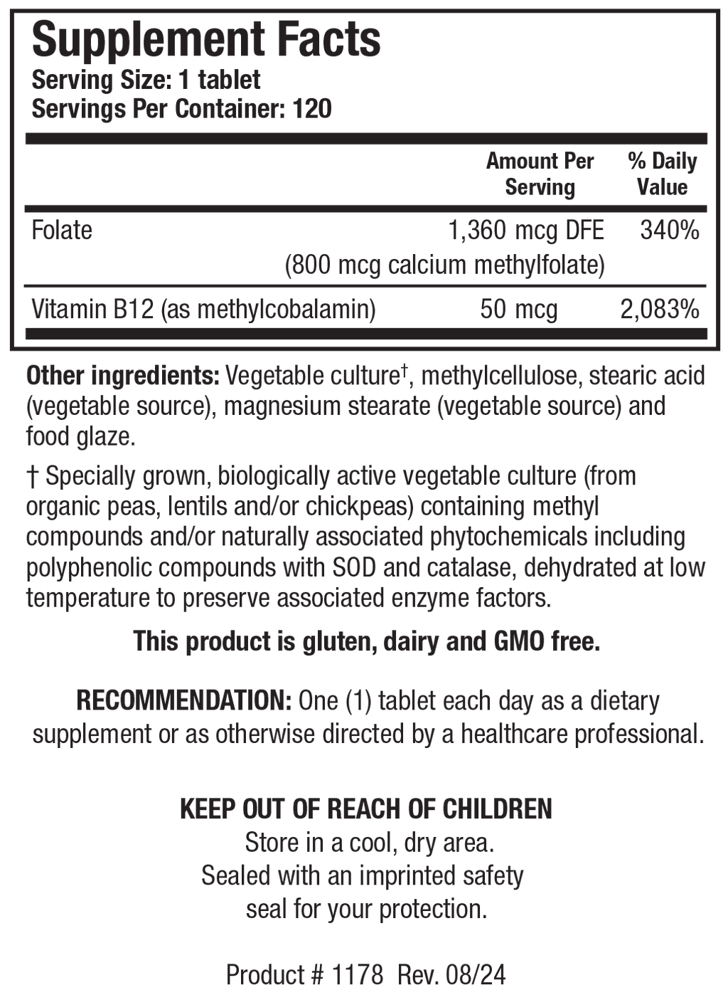 Methylfolate Plus™ supplies folate as calcium methylfolate. Methylfolate is a highly absorbable, activated form of folate, which does not require enzymatic conversion to 5-methylfolate in the body. The salt form utilized in Methylfolate Plus™ is more stable than other forms of folate. Each serving (1/2 tablet) of Methylfolate Plus™ supplies 800 mcg of folate as calcium methylfolate, combined with 50 mcg of vitamin B12 as methylcobalamin in our biologically active, phytochemically rich vegetable culture base.