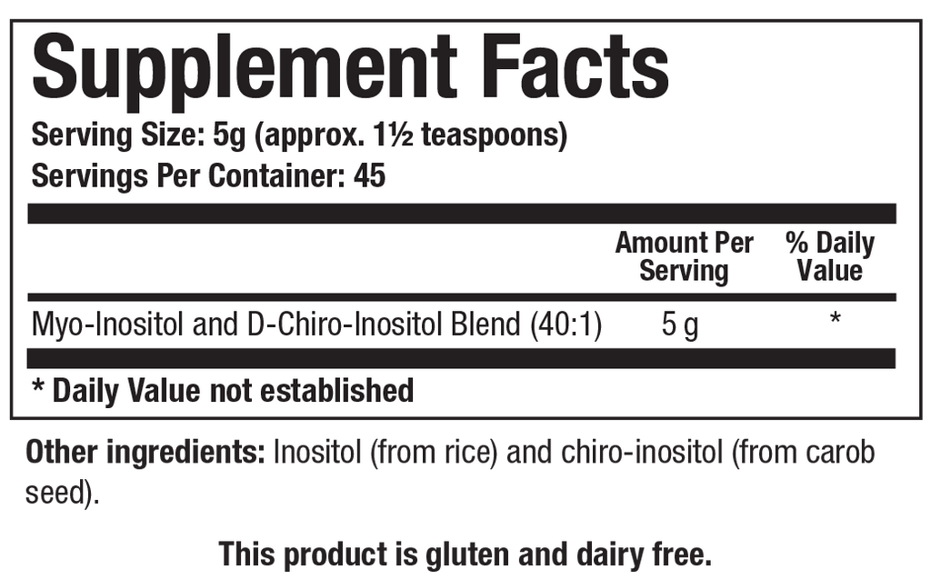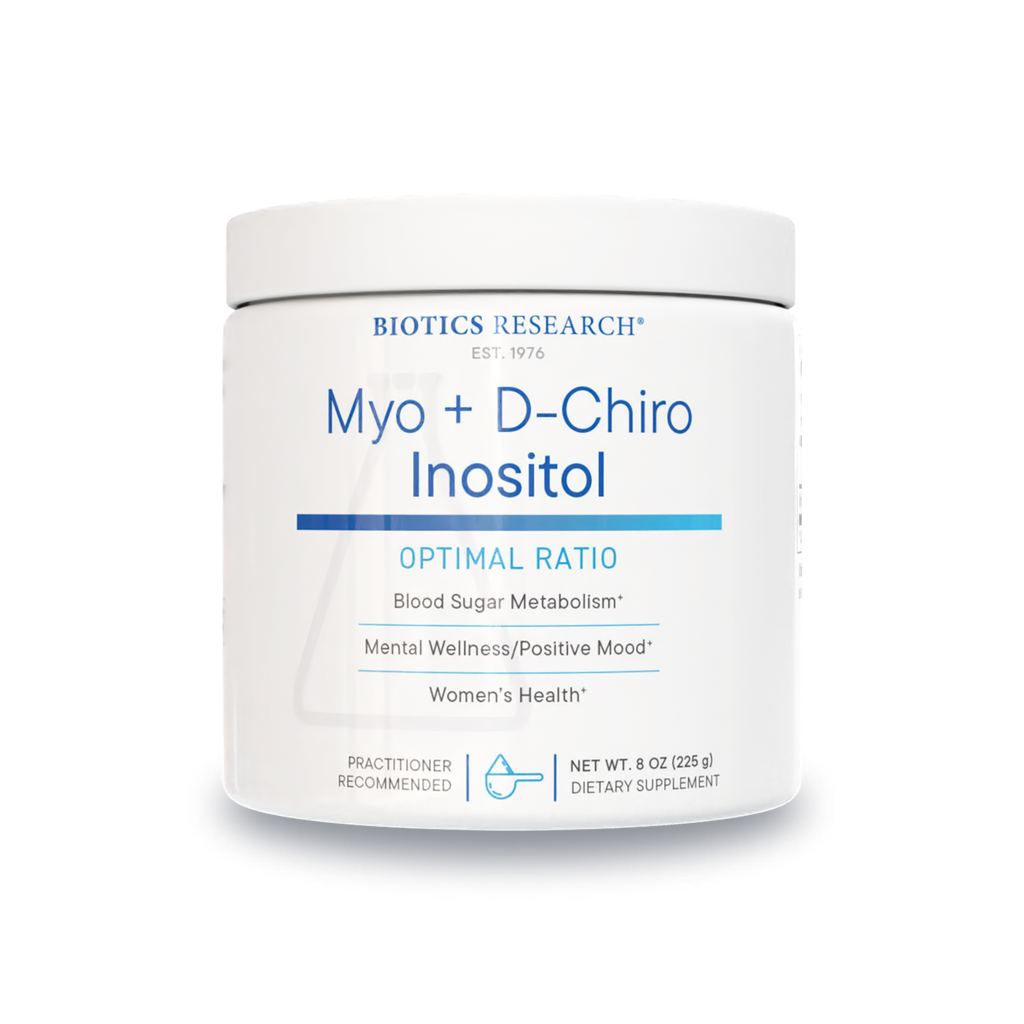 Myo + D-Chiro Inositol combines two isomers of inositol, Myo-inositol (MI) and D-chiro-inositol (DCI), in powder form. Inositol is a pseudo vitamin often referred to as vitamin B8. Research suggests that supplementing with the 40:1 MI and DCI ratio supplied by Myo + D-Chiro Inositol is the ideal ratio for optimal support. ME and DCI offer insulin-sensitizing capabilities and are involved in many cellular functions.* Inositol also assists in the transportation of fats throughout the body and in neural communication. It also functions to support vascular health, and is important in hair growth.* It is present in all body tissues, but the highest concentrations are found in the brain, heart and lens of the eye.