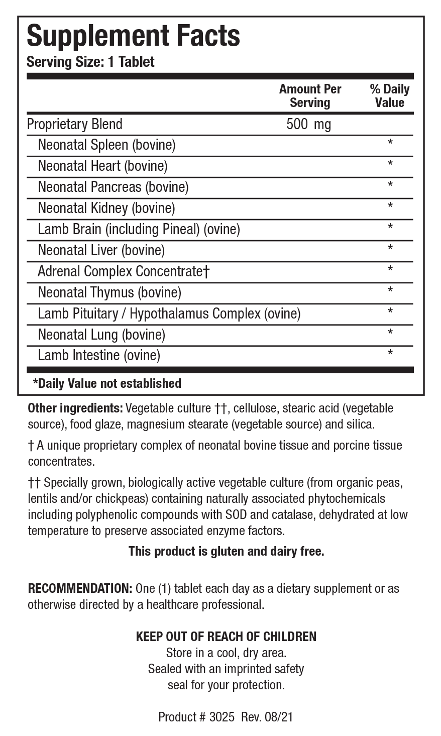 Neonatal Multi-Gland™ supplies a broad spectrum of organ and glandular concentrates. It includes neonatal spleen, heart, pancreas, kidney, brain, liver, adrenal, thymus, pituitary/hypothalamus complex, lung and intestinal glandulars. Since the early 1980's Biotics Research has been at the forefront of glandular production, reflecting its commitment to research and innovation. Glandulars from Biotics Research are prepared strictly from BSE-free countries, and collected under USDA inspection. The glandulars in the Neonatal Multi-Gland™ incorporate tissues from newborn calves, harvested specifically for Biotics Research, to ensure quality and to provide a reproducible source of bovine tissues. Tissues from newborn animals possess high anabolic activity, and have had minimal exposure to environmental stressors. Atrophy, fatty infiltration, tissue degradation, and the accumulation of oxidative waste products (lipofuscin) are not observed in tissues from newborn calves. The glandulars are prepared via treatment with mild solvents, and low temperatures; conditions known to preserve enzyme, protein and polypeptide factors.