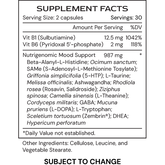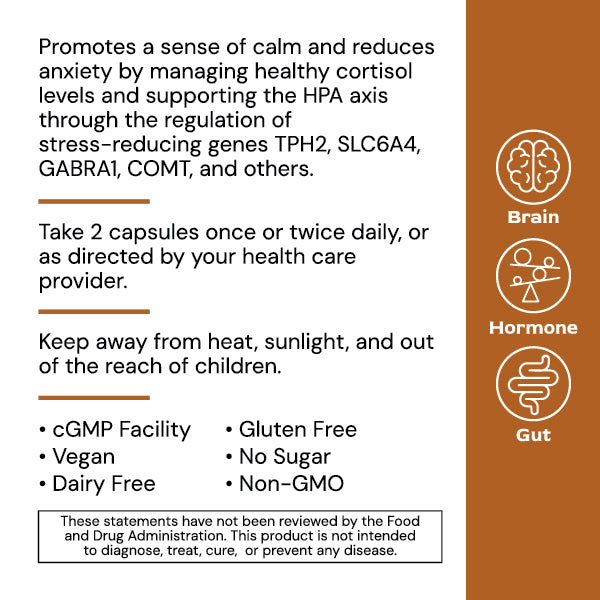 Promotes a sense of calm and reduces anxiety by managing healthy cortisol levels and supporting the HPA axis through the regulation of stress-reducing genes TPH2, SLC6A4, GABRA1, COMT, and others.