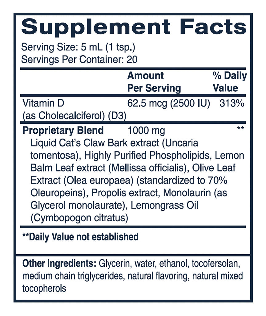 Cat’s Claw V-Max is a targeted blend of botanicals and nutrients designed to support the body’s natural defenses against microbial stressors and facilitate a resilient immune response. Vitamin D3, liquid Cat’s Claw extract, lemon balm, olive leaf, propolis, monolaurin, and lemongrass oil help support a productive immune response, making the body less hospitable to these common stressors.