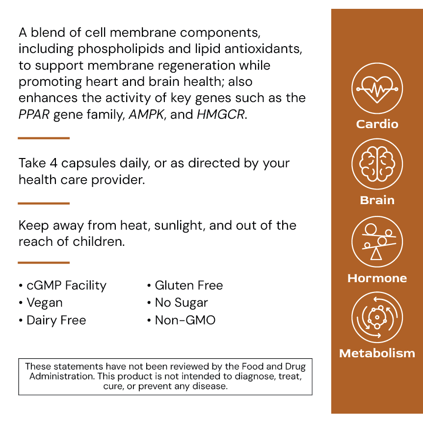 A blend of cell membrane components, including phospholipids and lipid antioxidants, to support membrane regeneration while promoting heart and brain health; also enhances the activity of key genes such as the PPAR gene family, AMPK, and HMGCR.