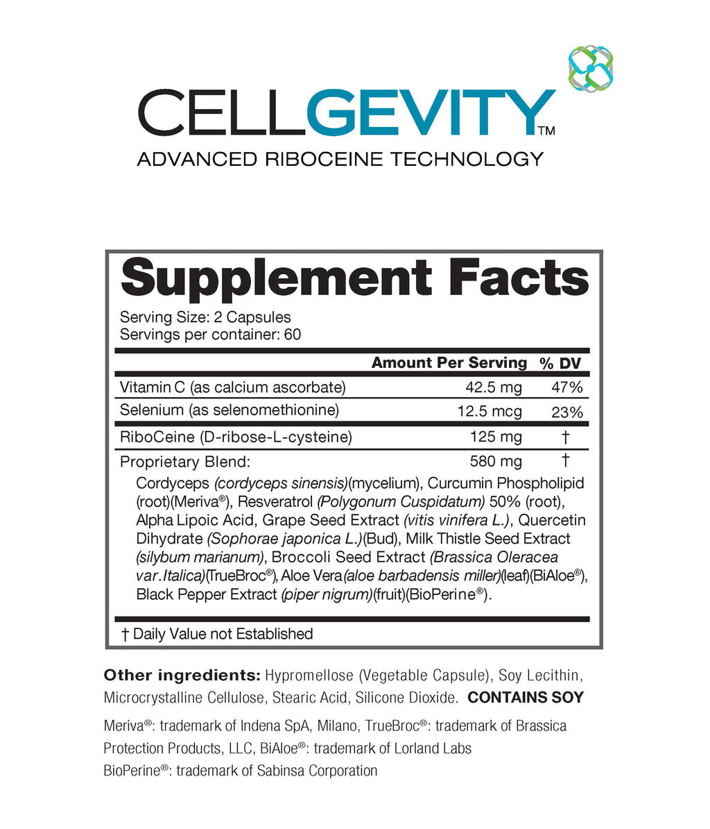 Cellgevity™ provides health and wellness support by providing the breakthrough compound RiboCeine™ and 12 other complementary ingredients. Cellgevity supports the production and function of glutathione, including supporting the removal of harmful toxins and neutralizing free radical damage.