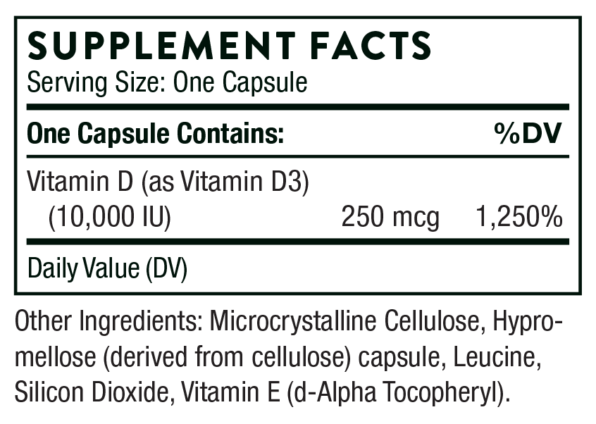 Vitamin D, in its D3 form, is more potent and better absorbed form than its D2 form. Thorne’s vitamin D supplements contain no lactose and no preservatives.