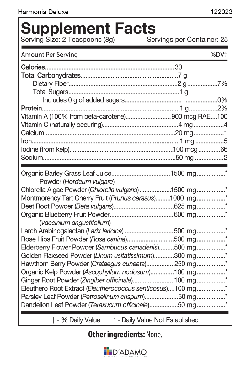 Dr. Peter D'Adamo, author of Eat Right 4 Your Type, specially developed this plant-based blend, which is right for all blood types. Now with a smoother consistency and containing a flavorful variety of ground sprouted seeds and grasses bursting with enzyme-rich nutrition, Harmonia Deluxe harnesses the power of the insoluble fiber found in plant-based greens to improve overall health.