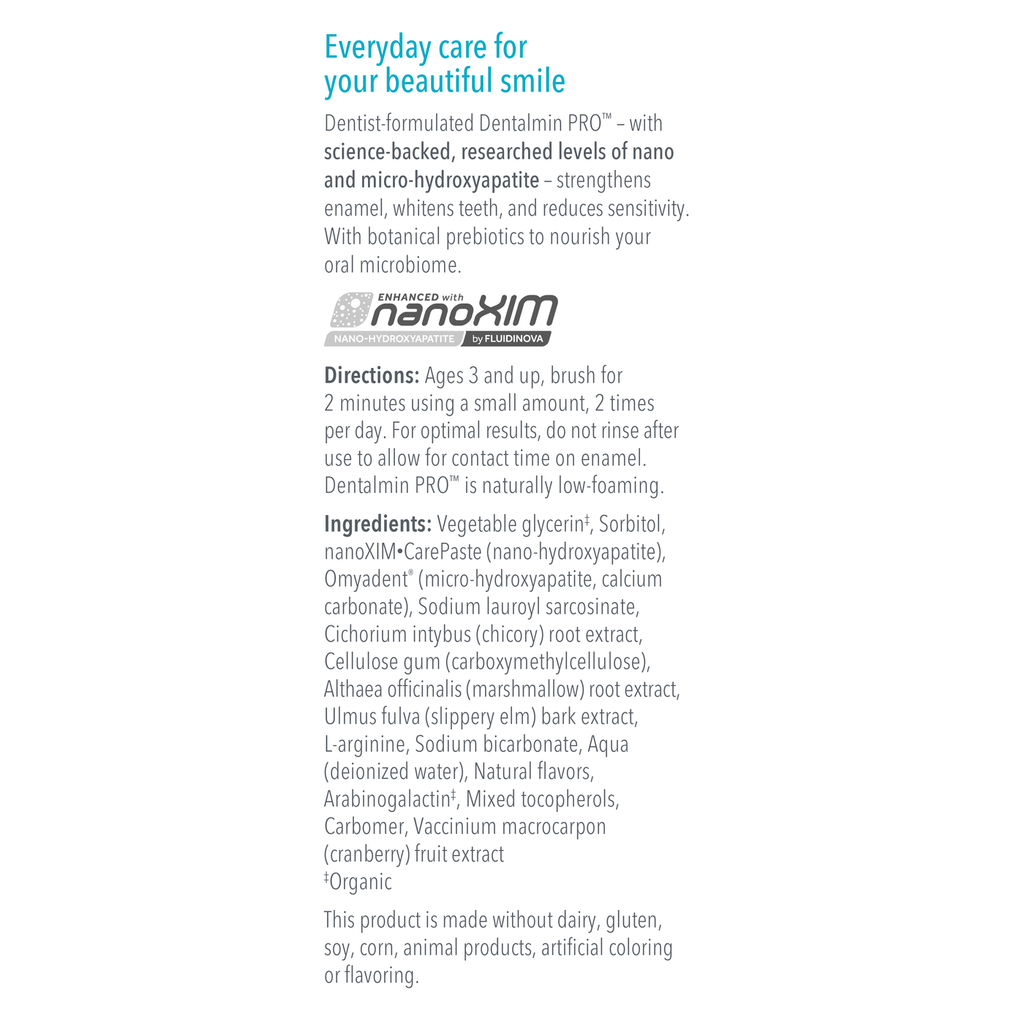 Dentalmin PRO™ is a uniquely powerful, fluoride-free, remineralizing toothpaste. Dentist-formulated, its ingredients are carefully curated for maximum benefit. It contains not one, but two forms of science-backed hydroxyapatite at researched levels.