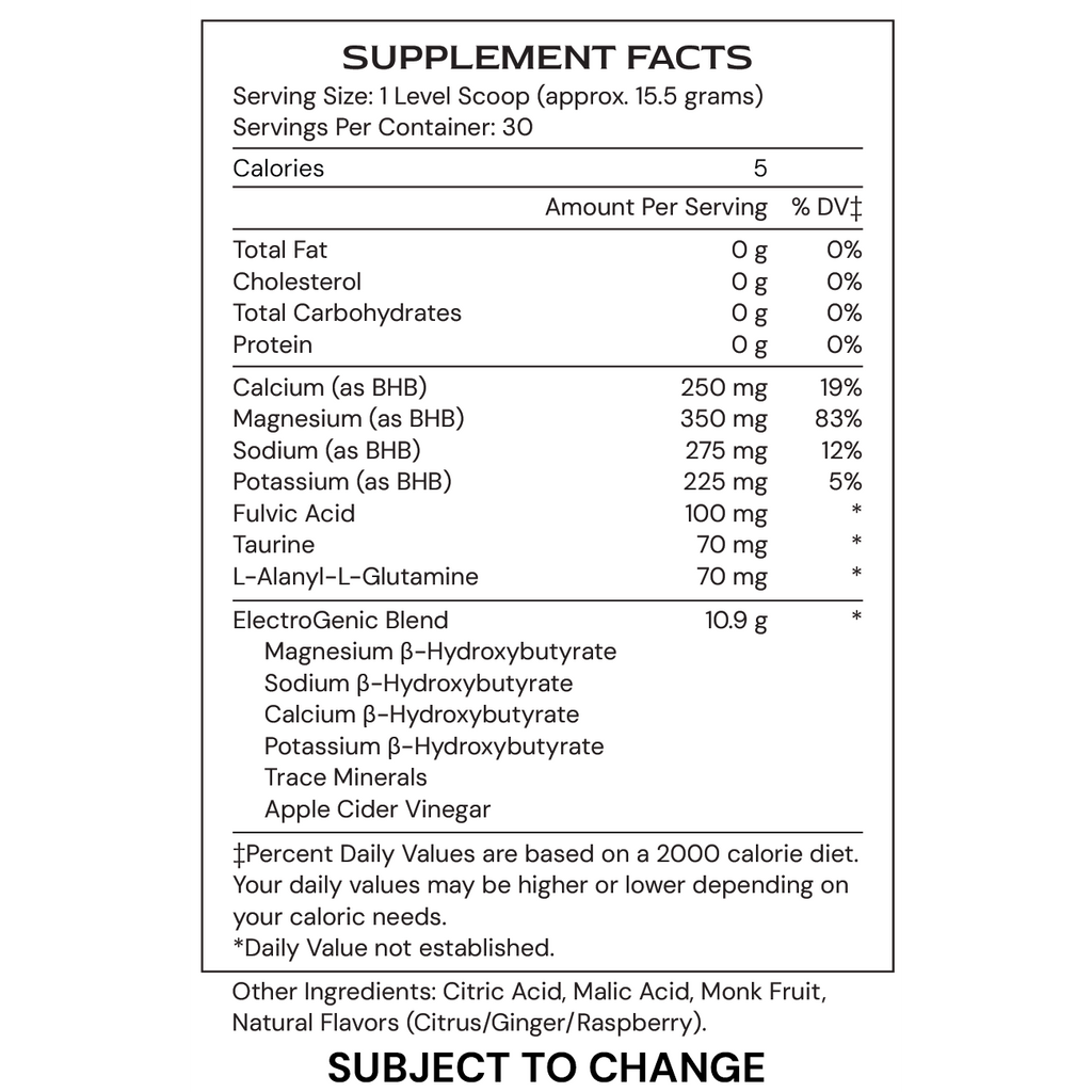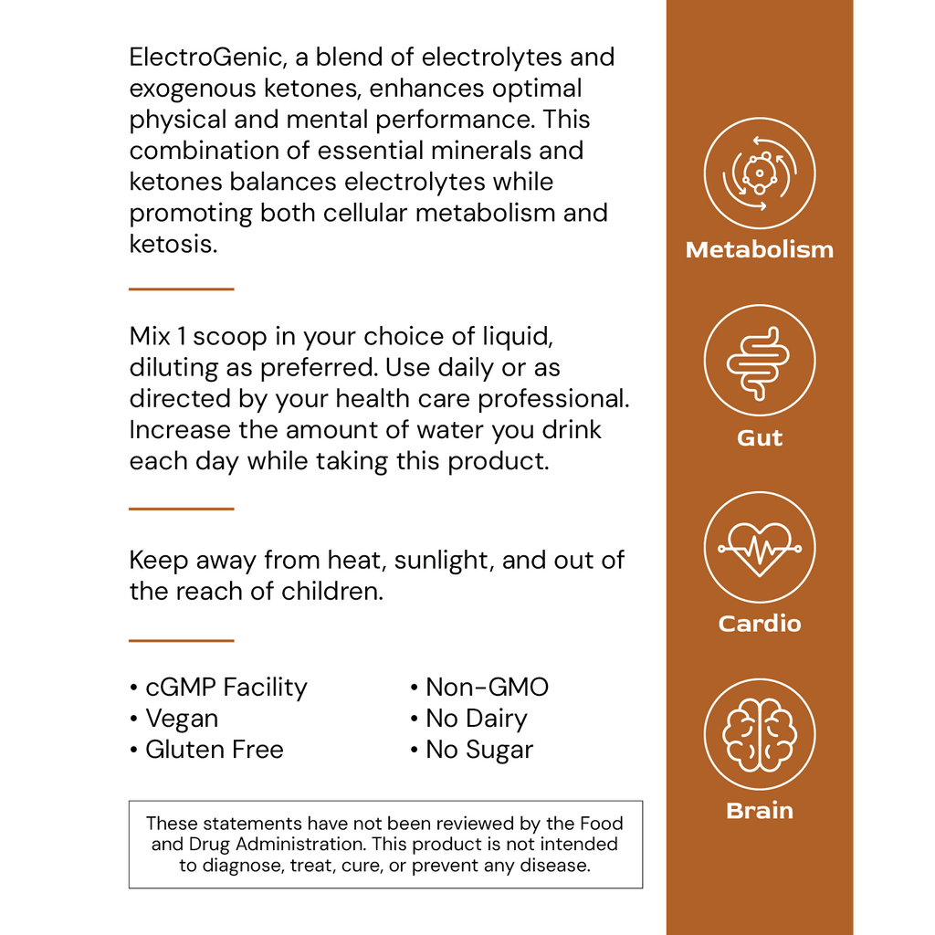 ElectroGenic, a blend of electrolytes and exogenous ketones, enhances optimal physical and mental performance. This combination of essential minerals and ketones balances electrolytes while promoting both cellular metabolism and ketosis.