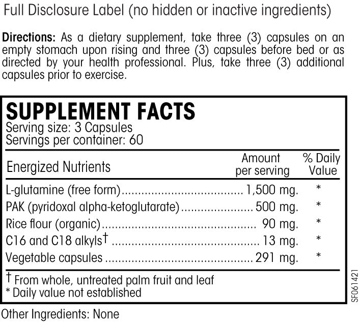 - Safely increases glutamine in the brain, muscle, and gut for significantly better energy production throughout the body. *