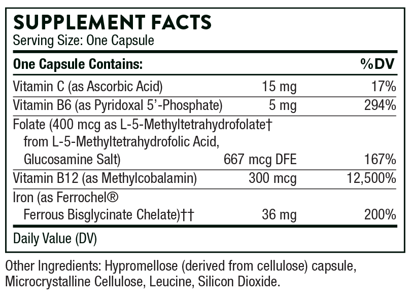 Ferrasorb provides 36 mg of elemental iron per capsule, plus the active forms of folate and vitamins B6 and B12, which are essential for blood-building. Vitamin C optimizes iron absorption.