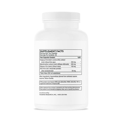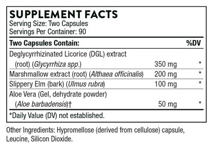 A comforting blend of botanical extracts – aloe vera, slippery elm, marshmallow root, and licorice – to calm irritation and soothe the mucous membranes of the GI tract*