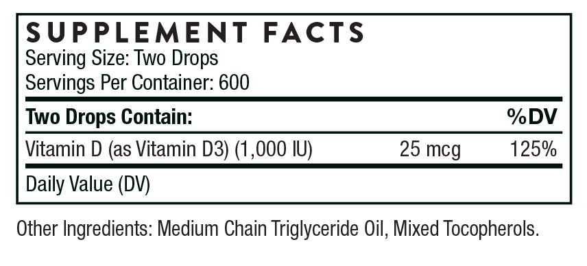 Vitamin D Liquid: Take 2 drops one to three times daily or as recommended by your health professional. Invert bottle to dispense individual drops. May be added to food or mixed in beverages. Do not refrigerate.