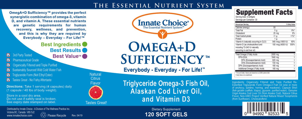 OMEGA+D SUFFICIENCY™ is the PERFECT SUPPLEMENT to PREVENT/REDUCE RISK of chronic illness and injury, RECOVER from chronic illness or injury, INCREASE HEALTH and FUNCTION of Brain, Heart, Digestion, Muscles, Nerves, and Bone and to INCREASE OVERALL PHYSICAL and EMOTIONAL WELLBEING.