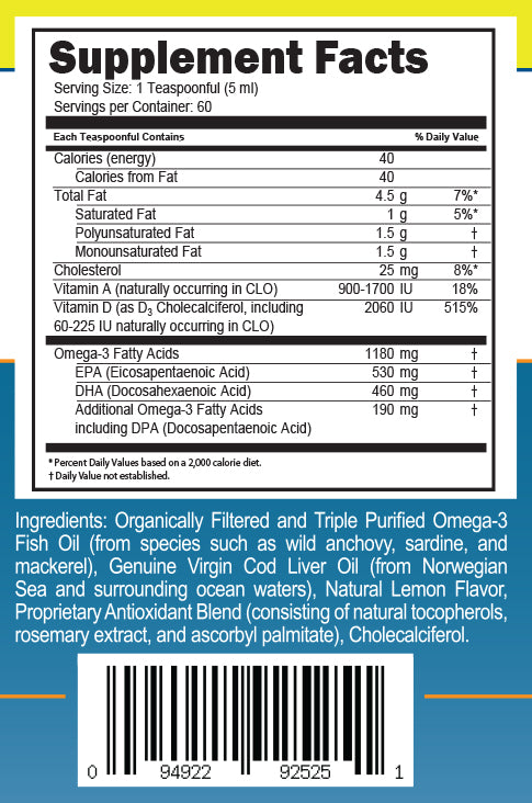 The WORLD’s ONLY “all in one” PERFECT SUPPLEMENT combining Norwegian Fish and Cod Liver Oils in order to supply the PERFECT amounts of EPA, DPA, and DHA Omega-3 fatty acids and the PERFECT synergistic amounts of Vitamins A and D creating the PERFECT SUPPLEMENT for inflammation and pain resolution, tissue healing, immune function, neuromuscular healing and performance, and overall recovery, wellness and prevention.