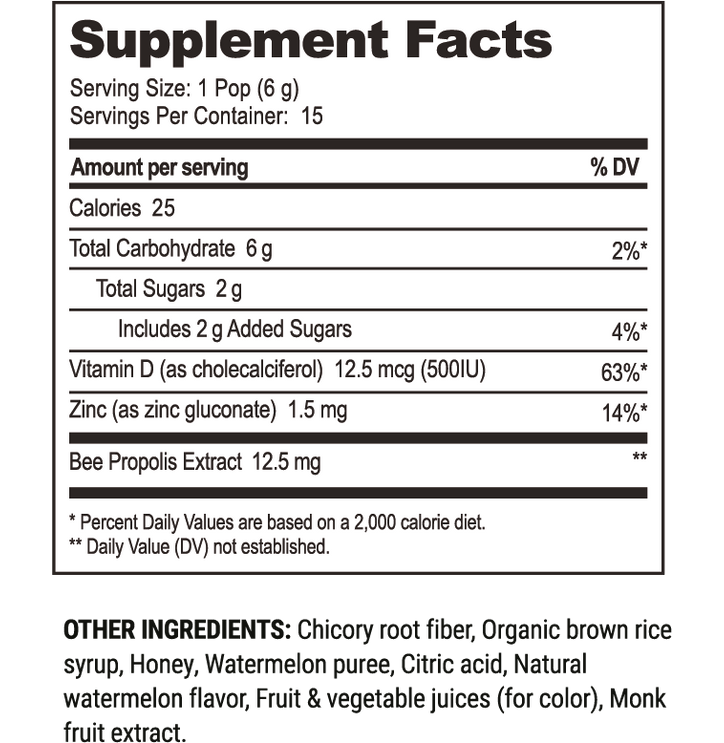 Our best-selling lozenges, now in a kid-friendly pop. Each pop is formulated with Propolis Extract, Vitamin D, Zinc, and Wildflower Honey to soothe scratchy throats and support immune systems. They'll never know it has 50% less sugar than the leading pop lozenge
