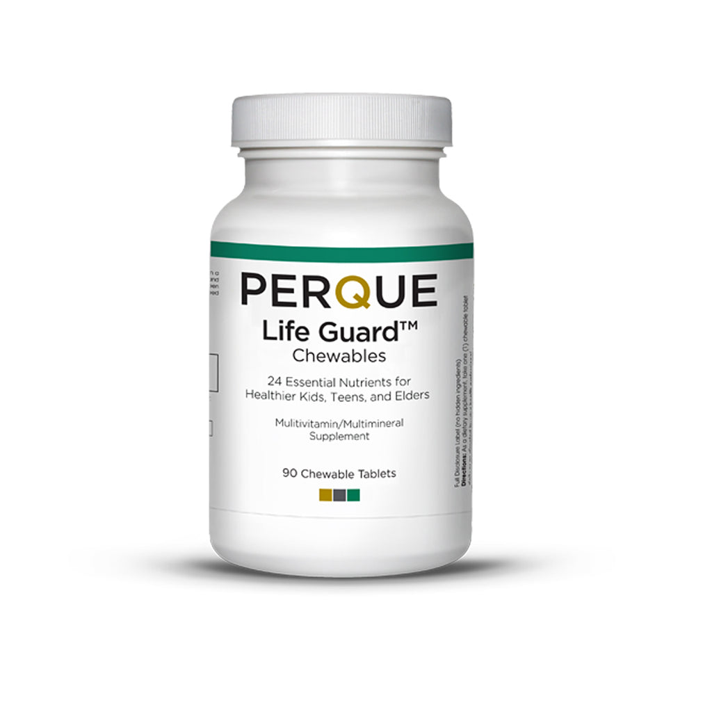 PERQUE Life Guard™ Chewables are a great-tasting, comprehensive 24-nutrient formula for both children and adults. Only the PERQUE complete formula includes the following important nutrients for children that many others leave out: chromium to aid in sugar metabolism;* silica to promote bone, hair, skin, and connective tissue health;* manganese to support sugar metabolism and bone and connective tissue health;* and biotin to promote proper fat, protein, and sugar metabolism. What you don’t find in supplements is often just as important as what you do find. PERQUE Life Guard Chewables are free of iodine, iron, and copper. These nutrients should always be taken separately. When included in a daily foundational multi-vitamin formula, they can oxidize the antioxidants and cause free radical damage. Additionally, iron should always be taken separately as it competes with calcium and zinc.