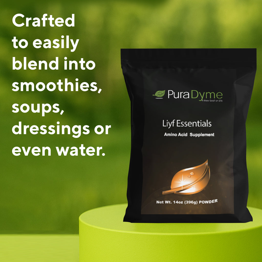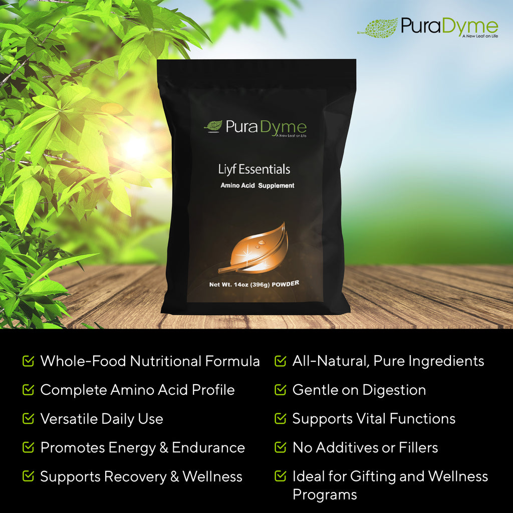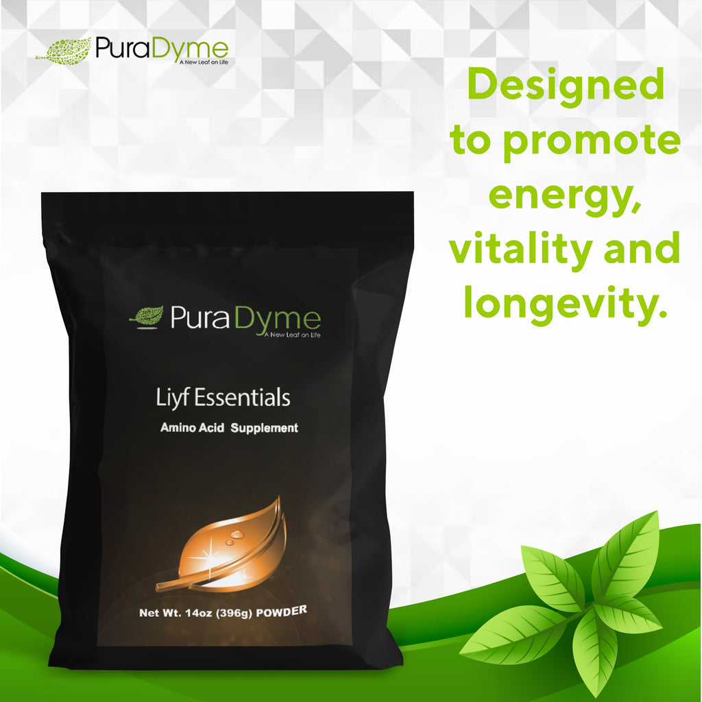 PuraDyme’s Liyf Essentials is the perfect way to ensure balanced nutrition! Unlike simple protein powders, Liyf Essentials is a whole-food, amino acid complex formulated for the promotion of energy, health and longevity! This product contains a complete profile of essential nutrients, including all 21 amino acids, that can be used to enhance the nutritional value of smoothies, dressings, and soups etc.