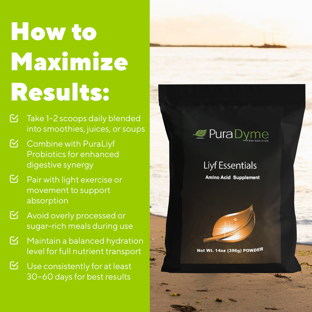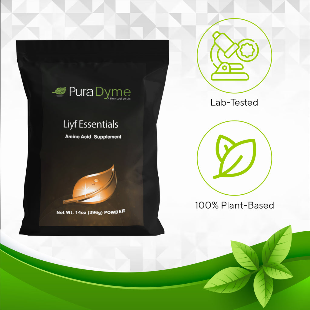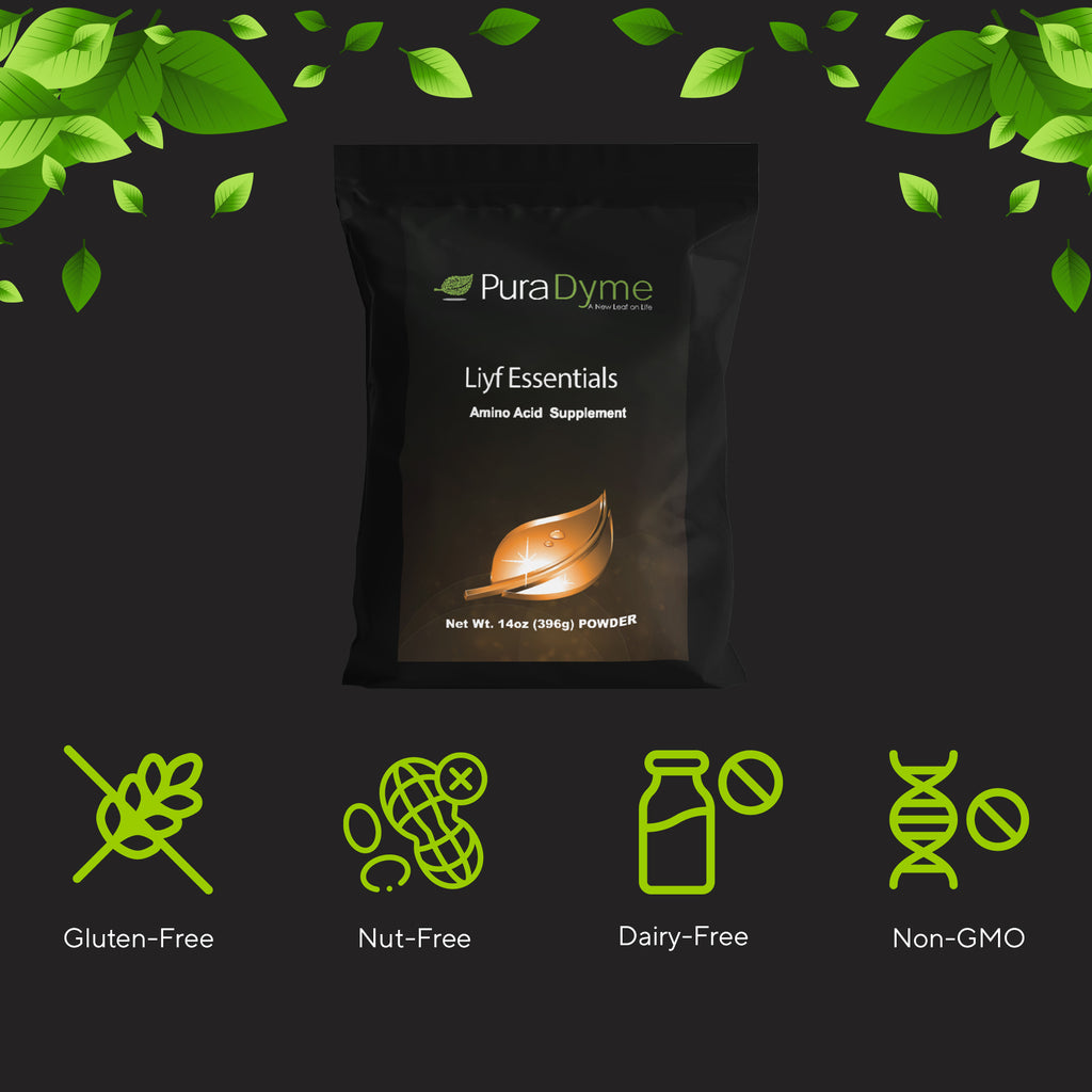 PuraDyme’s Liyf Essentials is the perfect way to ensure balanced nutrition! Unlike simple protein powders, Liyf Essentials is a whole-food, amino acid complex formulated for the promotion of energy, health and longevity! This product contains a complete profile of essential nutrients, including all 21 amino acids, that can be used to enhance the nutritional value of smoothies, dressings, and soups etc.