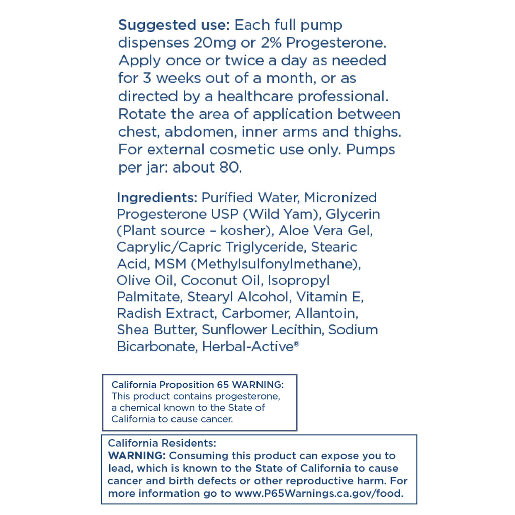 The dosage pump consistently delivers 20 mg of progesterone per use. The progesterone is micronized and combined with MSM in the formula to aid in transdermal absorption. Rotate the area of application daily between the abdomen, chest, inner arms, and thighs for optimal results.