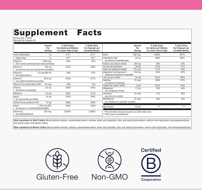 Directions: Take one packet daily with food or as directed by your healthcare practitioner. Each packet contains two (green) multi tablets and four (white) mineral tablets.