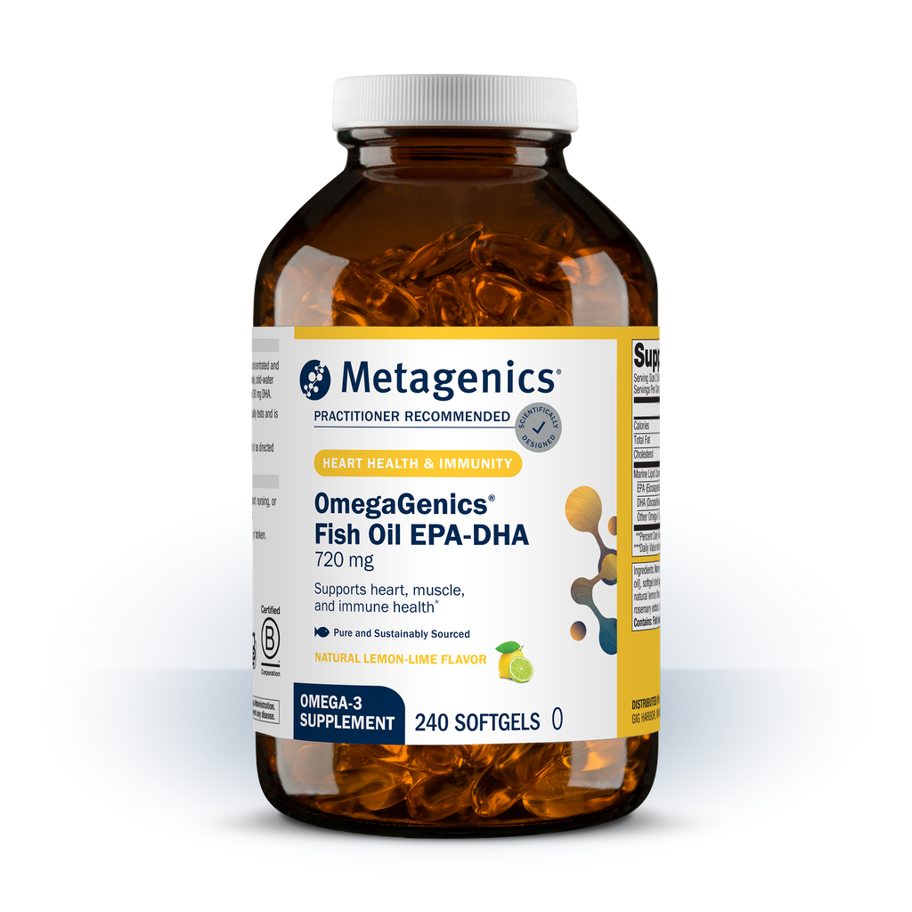 OmegaGenics® Fish Oil EPA-DHA 720 mg is a high-quality, multi-benefit fish oil. Each serving provides 430 mg of EPA and 290 mg of DHA from naturally sourced 100% wild-caught fish. Rigorously tested for 200 contaminants including heavy metals, enviornmental toxins, & plasticizers from microplastics.