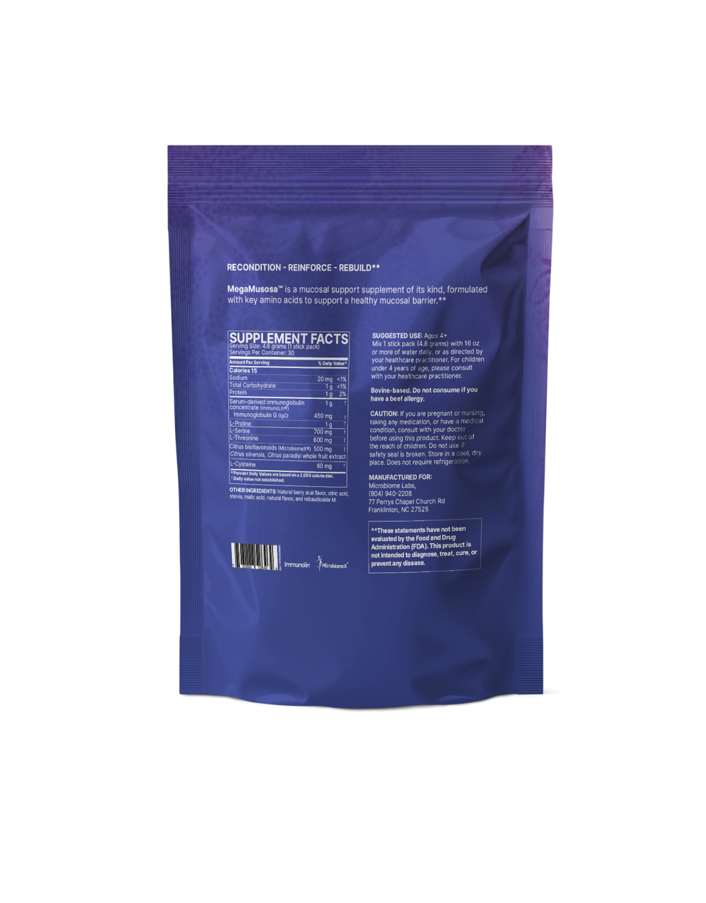 MegaMucosa’s NEW pre-measured stick packs are the first complete mucosal support supplement you know and love. Each portable pack contains dairy-free immunoglobulins clinically shown to support a healthy immune system in the mucosa and a state-of-the-art flavobiotic shown to support microbial diversity and short-chain fatty acid production.