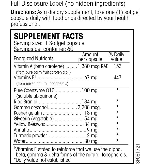 - Pure CoQ10 micellized into tiny droplets for maximum absorption.*