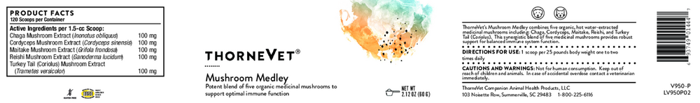 ThorneVet’s Mushroom Medley combines five organic, hot water-extracted medicinal mushrooms — Reishi, Turkey Tail, Cordyceps, Maitake, and Chaga. This synergistic blend of medicinal mushrooms provides robust support for balanced immune system function. The Mushroom Medley blend is ideal for supporting patients with weakened immune function, including providing support for patients undergoing treatment for cancer.