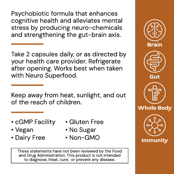 Psychobiotic formula that enhances cognitive health and alleviates mental stress by producing neuro-chemicals and strengthening the gut-brain axis.
