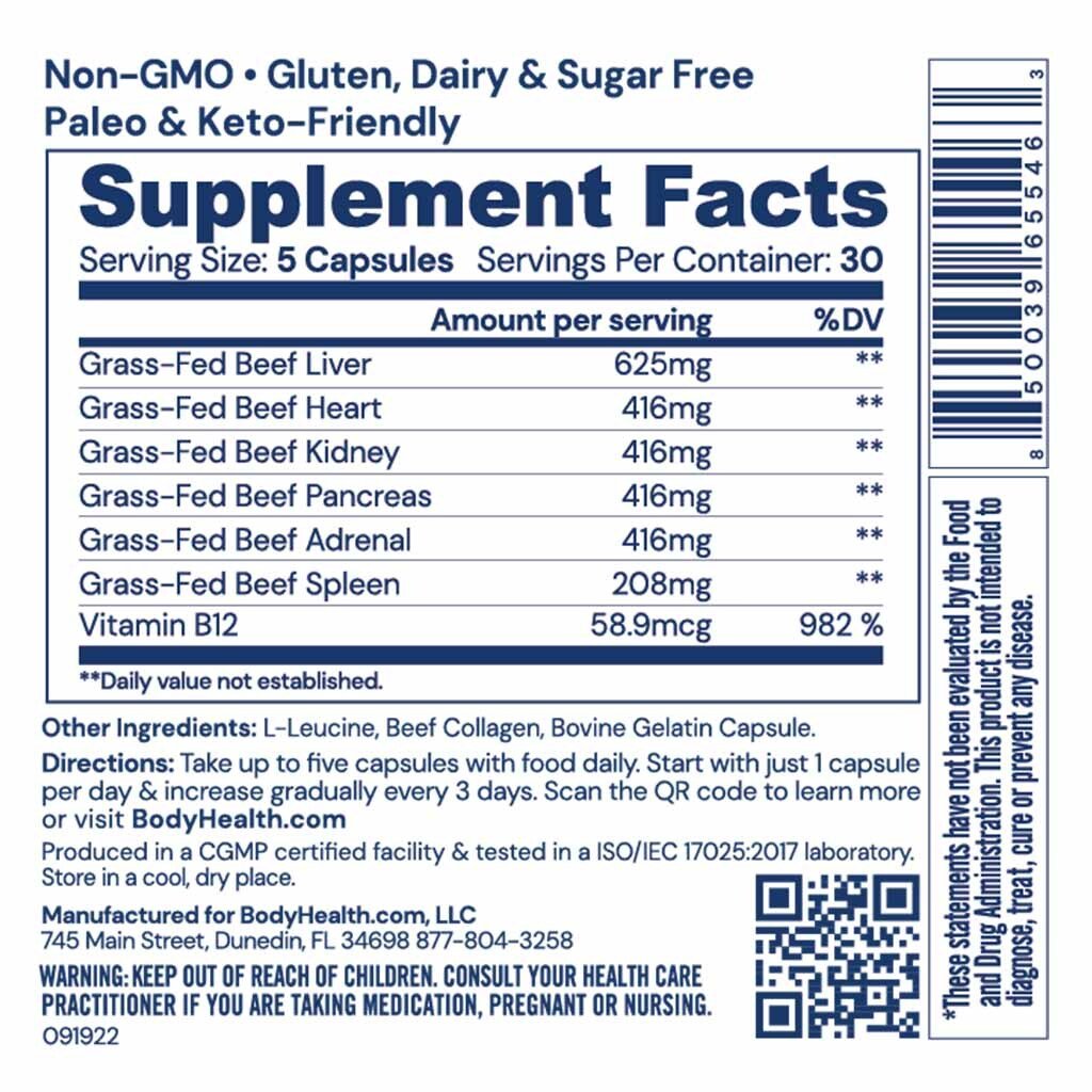 An easy-to-take supplement containing 6 of natureís most power-packed superfoods to give you the energy to live your life to the fullest. Forget about cooking (and tasting...!) liver, heart, and other beef organs ñ now you can use them to supercharge your body in a quick, easy, capsule form to boost your energy levels, enhance your immune system function, increase blood flow, boost heart health, and stimulate brain health!