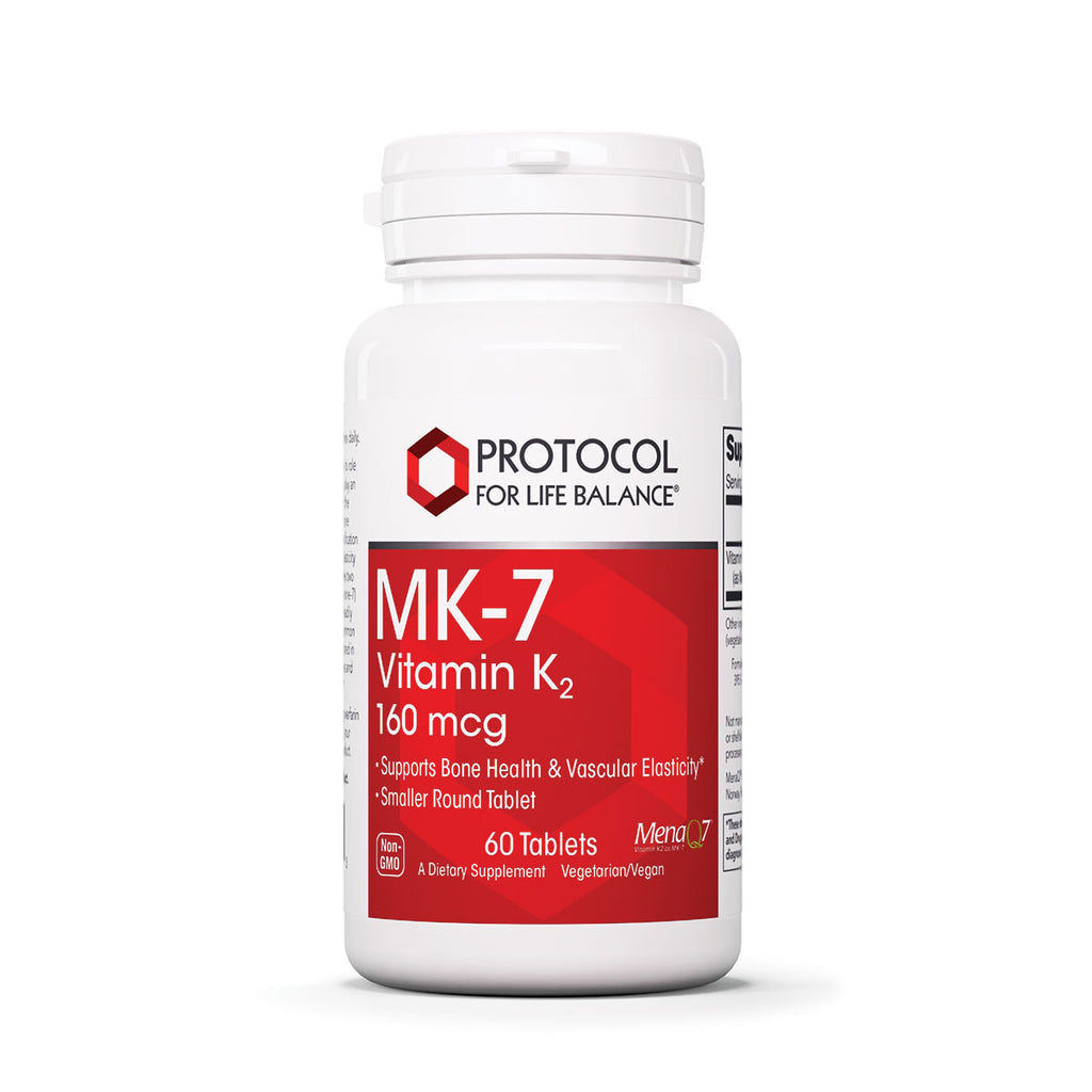Vitamin K is well known for its role in blood clotting, but has also been found to play an important role in normal bone formation and the preservation of bone strength.* Vitamin K2 more specifically is a significant regulator of tissue calcification and is critical for the maintenance of arterial elasticity and cardiovascular health.* Vitamin K2 includes two of the most studied subtypes, MK-7 (menaquinone-7) and MK-4 (menatetrenone). MK-7, the most readily absorbed and bioactive form of K2, has no common dietary sources.* Unlike vitamin K1, which is stored in the liver, MK-7 is transported directly to tissues and has a longer half-life than either K1 or MK-4.* MenaQ7® is a registered trademark of NattoPharma ASA, Norway. Patents granted and pending.