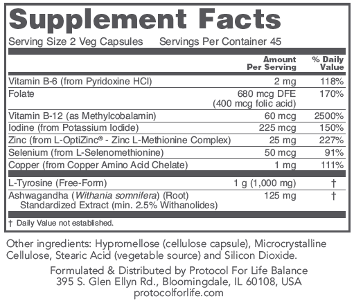 Ortho Thyroid™ has been carefully formulated to support thyroid and glandular activity, which are key factors to support optimal brain function and the production of energy.* With tyrosine and iodine, the two constituent nutrients of thyroid secretions, combined with specific B vitamins, zinc, selenium, and other trace minerals, this formula represents a comprehensive nutritional supplement for the support of healthy thyroid function.* Ashwagandha extract has also been included to complement the nutritional component of this formula.* L-OptiZinc® is a Lonza trademark.