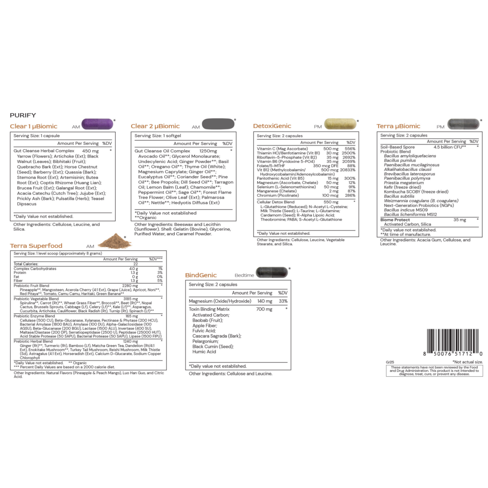 Purify combines Clear 1 µBiomic, Clear 2 µBiomic, Terra µBiomic, Terra Superfood, DetoxiGenic, and BindGenic.