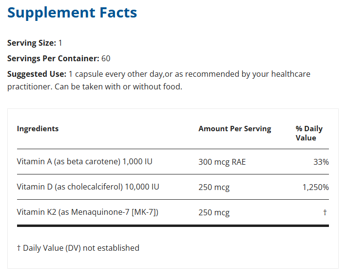 - Provides 10,000 IU vitamin D3, balanced with vitamins K2 and A.