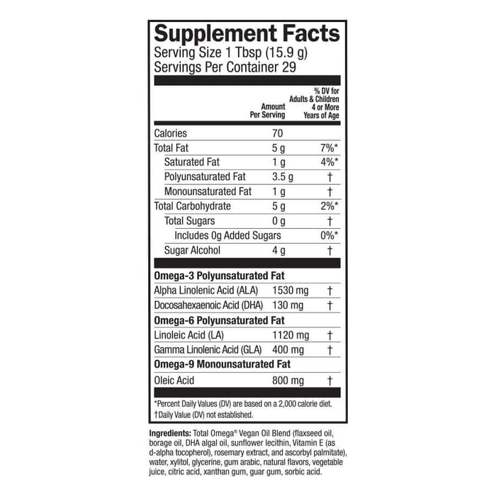 Complete and balanced. This unique blend of fresh, cold-pressed flax and pure borage oils offers a complete and balanced source of the Omega-3, 6 and 9 fatty acids our brains and bodies need (but can’t make on its own). You get an incredible 1,530mg of plant-based ALA Omega-3 and 400mg of GLA in every tablespoon. But that’s not all: because Seriously Delicious Total Omega® is emulsified, you actually absorb 3X more of the nutrients than you do with regular flax or borage oils or softgels.