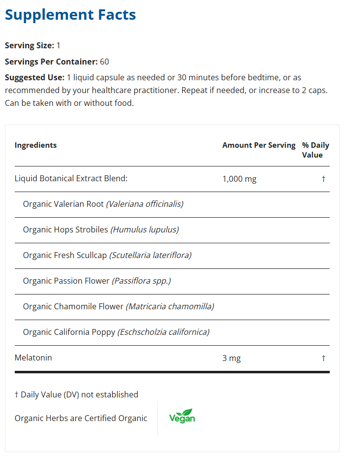 Suggested Use: 1 liquid capsule as needed or 30 minutes before bedtime, or as recommended by your healthcare practitioner. Repeat if needed, or increase to 2 caps. Can be taken with or without food.