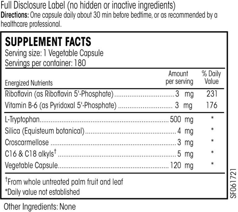 - Pure L- tryptophan formulation with vitamins B2 and B6 for enhanced uptake and function.*